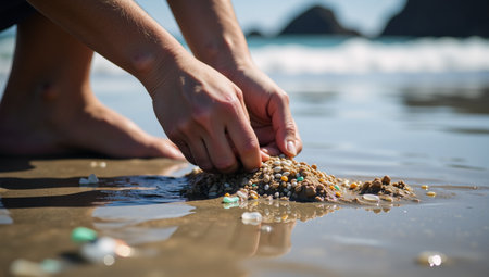 hands gathering microplastic debris from polluted beach waters for ecological awareness and conservation promotion