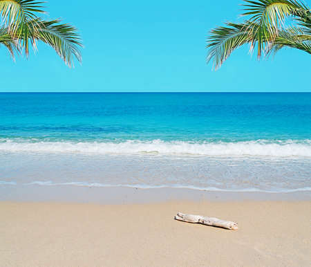Tropical summer sand beach on sea sky background, copy space.
