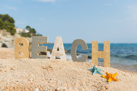 Word beach in the sand against the sea sun. concept symbol of holiday.