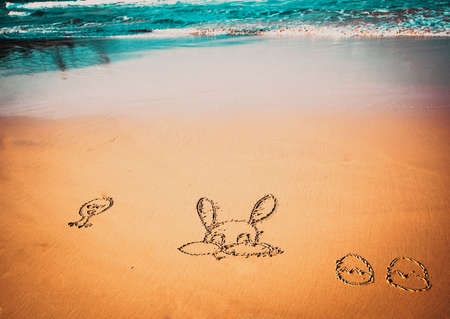 easter bunny and eggs in the sand by the seaside