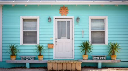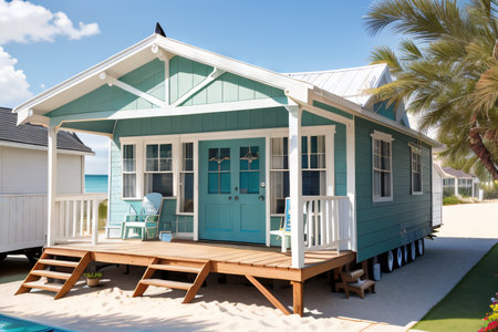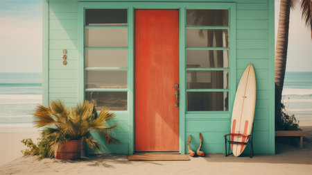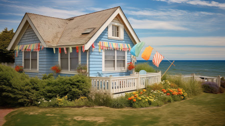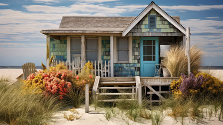 A quaint beach house surrounded by nature and ocean waves, ideal for relaxation. AI generated image