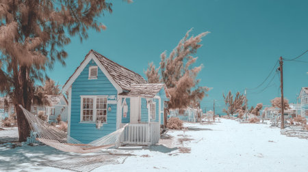 A quaint blue cottage with a white porch stands in a serene outdoor environment. A hammock hangs near a tree, suggesting leisure. The scene is bathed in soft light, complemented by a clear blue sky. It could be used in various commercial or editorial projects related to travel or lifestyle.