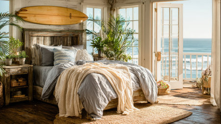 A bedroom showcases a bed adorned with a soft throw, positioned by windows overlooking the ocean. The scene features natural light, wooden furnishings, and decorative plants. This image may be suitable for interior design projects, travel articles, or lifestyle-themed publications. The composition highlights a sense of relaxation.