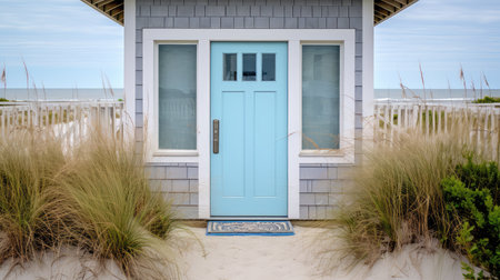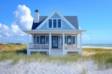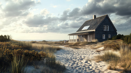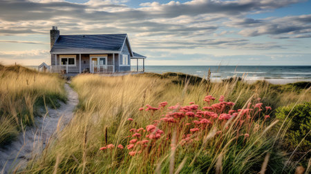 This tranquil scene captures a beach cottage overlooking the vast ocean. Soft sunlight illuminates the sandy beach and the gentle waves. The composition focuses on natural elements, featuring a clear sky and beach grass. It could be used for travel, tourism, or lifestyle content.