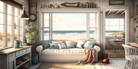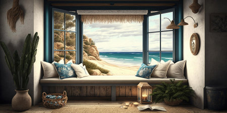 Coastal retreat interior with ocean view and rustic decor. That the image is generated using AI.