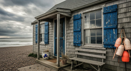cottage residential exterior with weathered shingles, a wraparound porch, and beach-inspired decor. Generative AI