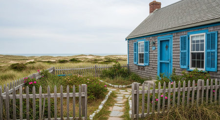 cape cod house exterior, with view of ocean and beach in the distance, created with generative ai