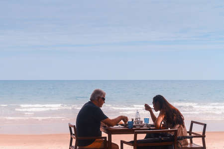 Rayong, Thailand - August 06, 2016: Unidentified Man And Woman During Having Lunch At Restaurant Near The Sea.