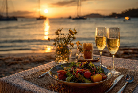 A close-up captures a beautifully arranged meal with champagne glasses and fresh salad on a table. The scene is bathed in warm sunset colors, with water and boats visible in the background. This image has commercial applications for illustrating dining, travel, or romantic occasions.