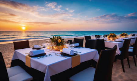 Restaurant table set for dinner on the beach at sunset.