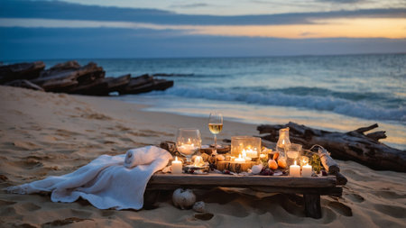 Atmospheric beach scene at sunset: a rustic wooden table on the sand decorated with glowing candles in glass jars, natural driftwood, and soft fabrics. The warm candlelight and gentle waves in the background create a romantic and peaceful ambiance. No people, ideal for themes of love, relaxation, nature, and intimate moments.