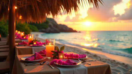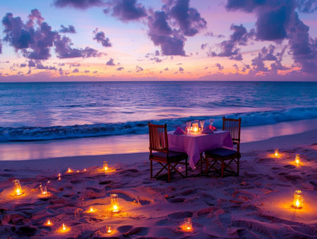 Romantic candlelit dinner on tranquil tropical coastline, luxury vacation destination generated by artificial intelligence