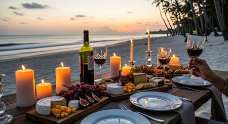 A beautifully arranged table features wine, candles, and a selection of food, creating a romantic dining experience. The warm, inviting glow of the candles illuminates the scene, set against a backdrop of a beach and the ocean at dusk. Ideal for commercial applications, illustrating leisure and lifestyle themes.
