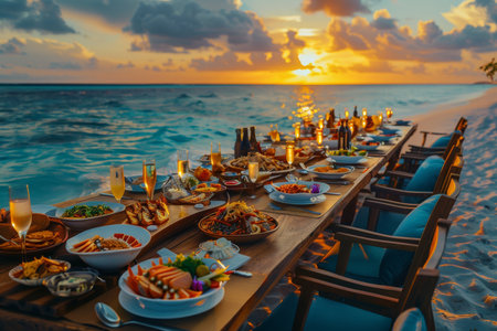 Romantic candlelit dinner party on a sunset beach setting generated by artificial intelligence