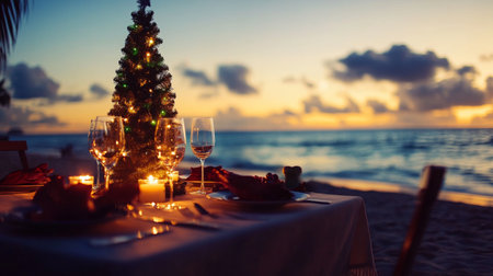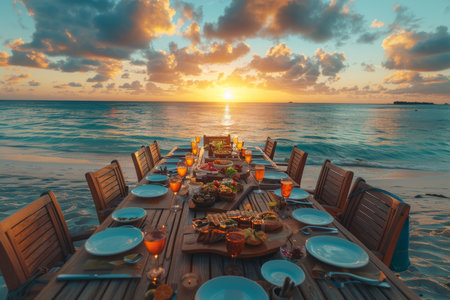 Luxury Beachside Dining, Sunset Views, Romantic Dinner A beautifully set dining table on the sand, with fine china, elegant candles, and a view