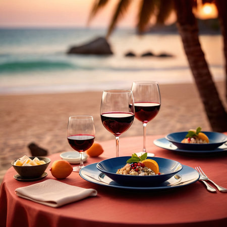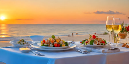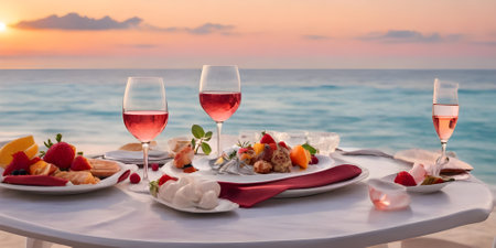 Romantic sunset dinner on the beach. Table honeymoon set for two with luxurious food, glasses of rose wine drinks in a restaurant with sea view.