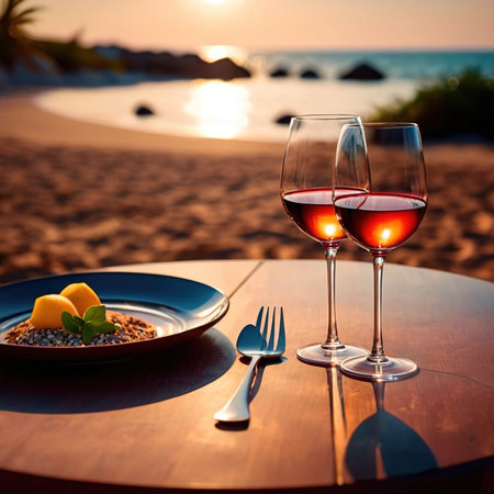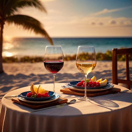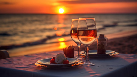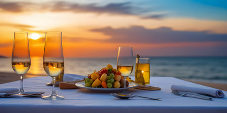 Romantic dinner setting on the beach at sunset. Glasses of white wine, plate with grapes, wineglasses, cutlery on the table.