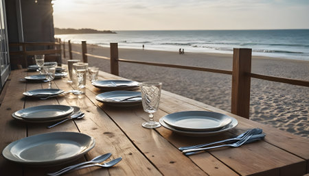 A long table with a beautiful ocean view in the background. The table is set with plates, glasses, and utensils, and there are several chairs around it. The atmosphere is relaxed and inviting
