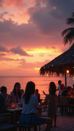 A vibrant sunset casts a warm glow over a lively beach restaurant, where friends gather to enjoy drinks and laughter. The scene captures the essence of summer evenings, with silhouettes of people enjoying the picturesque view and the soothing sound of waves.