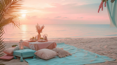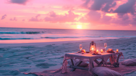 A charming beach picnic setup features candles, wine glasses, and a basket of flowers. The scene includes pillows and a blanket, creating an inviting atmosphere. Soft lighting and warm colors evoke a relaxing ambiance. Suitable for editorial and commercial use, this image could illustrate romance or lifestyle.