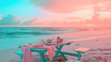 sea picnic experience, set up an outside table at sunset on the beach, in the style of pink and cyan, romantic seascapes.