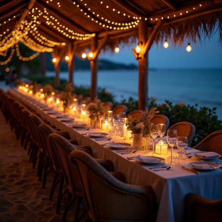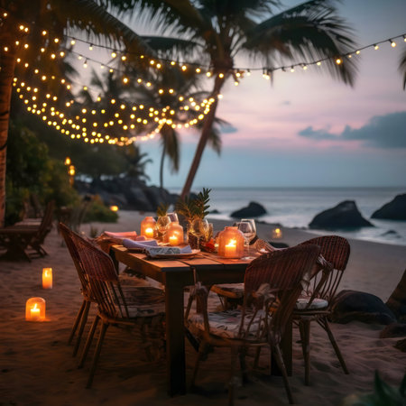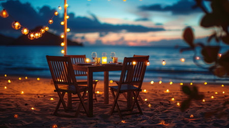 beachside romantic dinner, fairy lights twinkling around a beach table, setting a warm and enchanting atmosphere for a romantic dinner for two