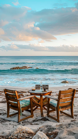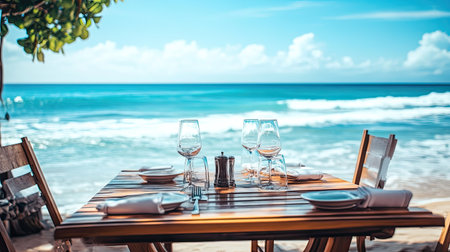 Experience the perfect beachside dining setting with stunning ocean views. Elegant table setup invites relaxation and enjoyment of a seaside meal.