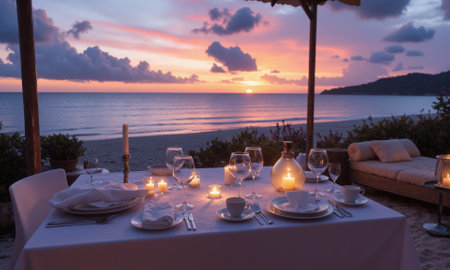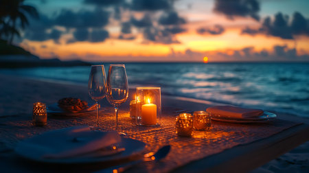 Romantic background with a candlelit dinner on the beach, featuring a beautifully set table, soft ocean breezes, and a sunset backdrop
