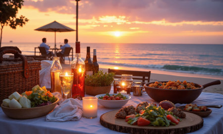 Sunset Beach Picnic A picnic spread with fresh salads, grilled vegetables, and chilled beverages set on a blanket, overlooking a vibrant sunset sky