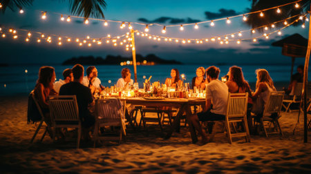 A vibrant beach gathering at dusk featuring friends enjoying an elegant dinner under twinkling fairy lights, creating a warm and inviting atmosphere.