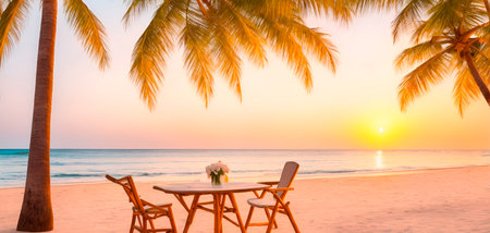 Beautiful romantic dinner set on the beach with palm trees at sunset