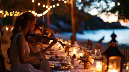 Beautiful young woman playing violin on the beach during a romantic dinner