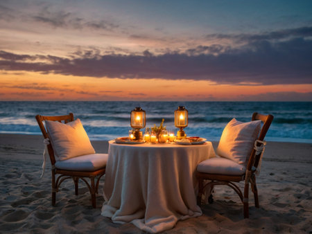 A romantic dinner setting on a sandy beach, with the ocean and a vibrant sunset in the background