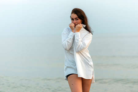 Close up portrait woman in a white tunic shirt on beach, near st
