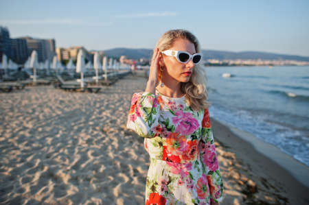 Blonde woman wearing dress and sunglasses standing on sand beach at sea shore enjoying view of sunset.