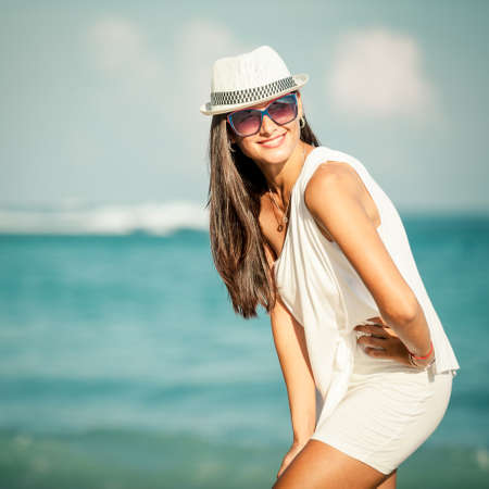 pretty woman with hat on island beach ocean summer fun