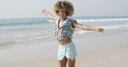 Young seductive african american girl near the sea, whirls and plays the fool in