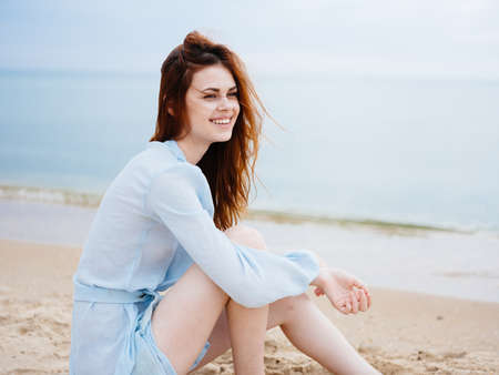 A romantic woman in a transparent blue dress sits on the sand near the sea and smiles