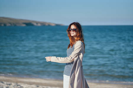 portrait of a red-haired woman in sunglasses in the mountains near the sea and smile laughing travel