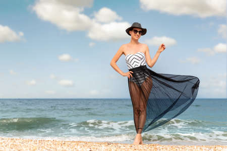 Young adult pretty attractive stylish slim sporty caucasian woman girl stand on seaside ocean beach wearing black transparent maxi skirt swimwear and hat. Luxury resort vacation travel day concept