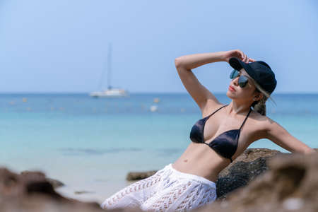Woman in black bikini on tropical beach. Portrait woman in swimwear enjoying and sitting on rock beach.