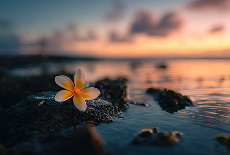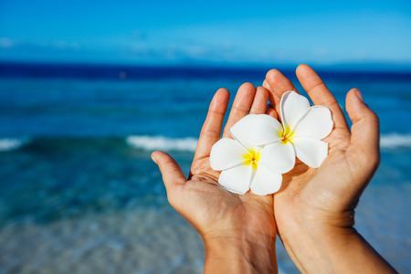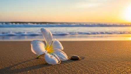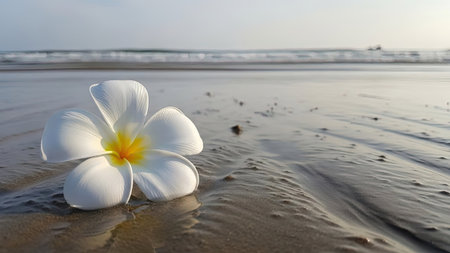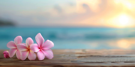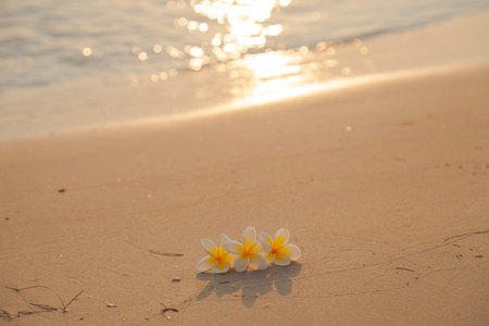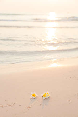 Tropical frangipani white flower near the sunset beach. flower spa. Copy space.