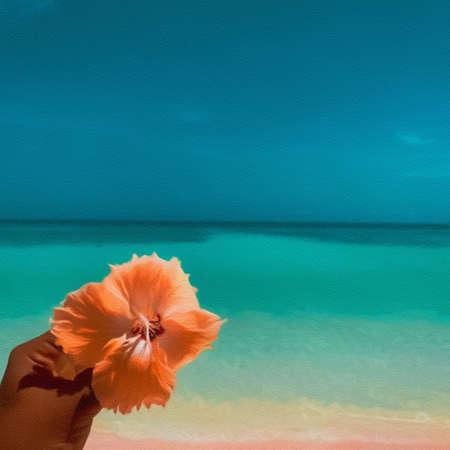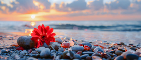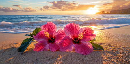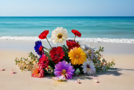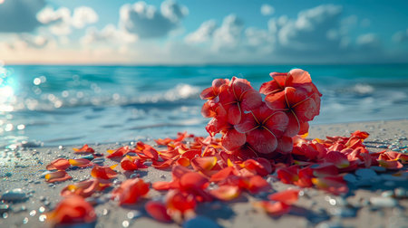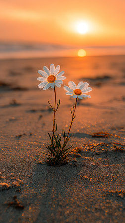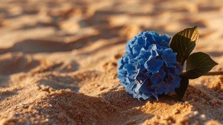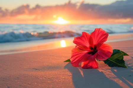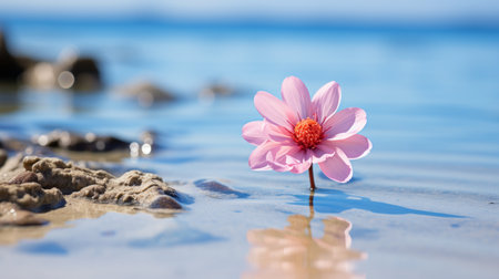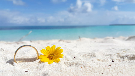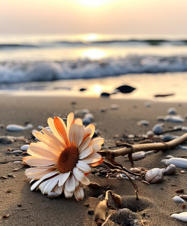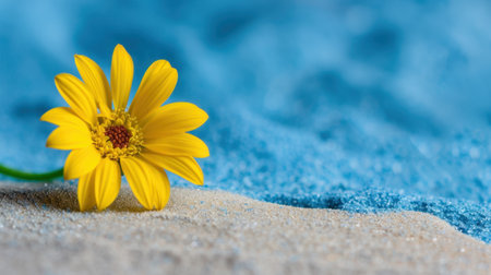 A vibrant yellow flower rests on a sandy beach, the ocean gently lapping in the background. The scene is serene and peaceful.