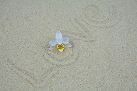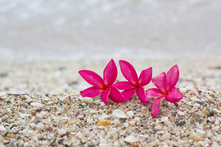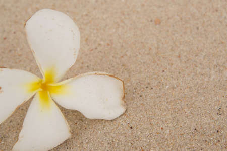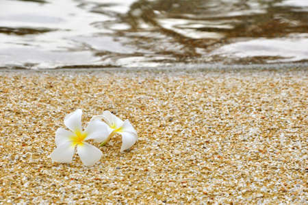 Blossom white frangipani flower on sand Beach at Hua Hin Thailand