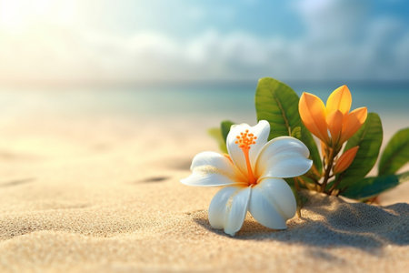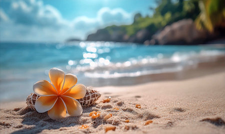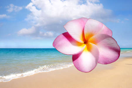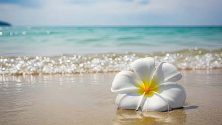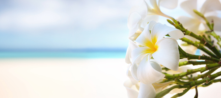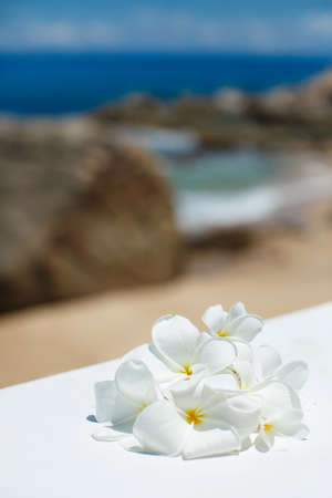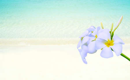 white plumaria flower with the beach, abstract spring nature, summer wallpaper background
