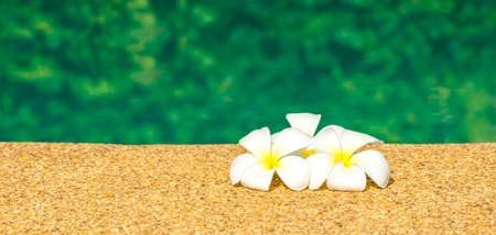 beautiful tropical Plumeria flowers on swimming pool with green garden reflection water, panorama