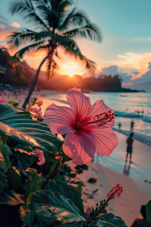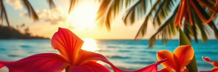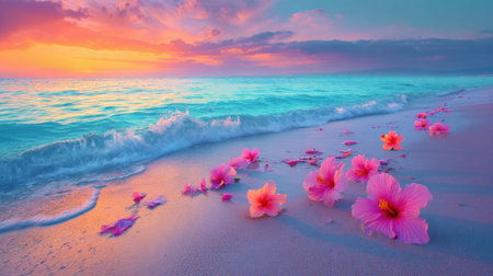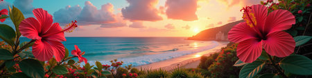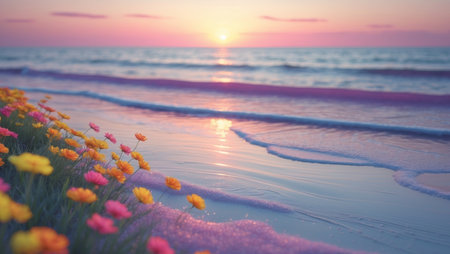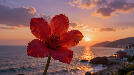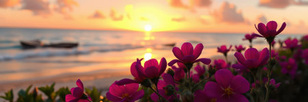 Beautiful sunset over the sea and pink flowers in the foreground.