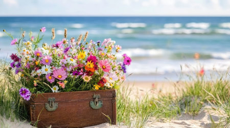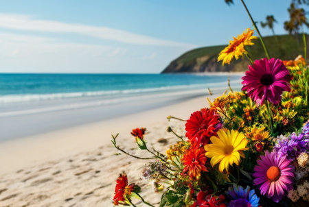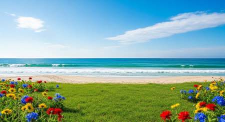 Image of beautiful flowers in the grass and exotic plants against the backdrop of the sea and clear sky