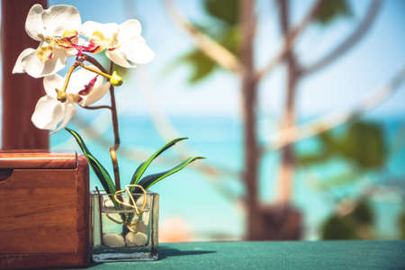 Table at tropical beach cafe with orchid and sea view and blurred beach background during summer beach holidays