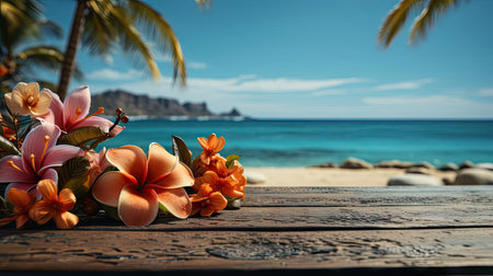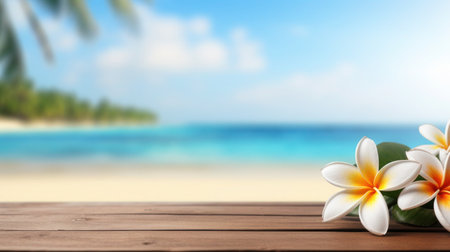 Empty wooden table top and blurred summer beach background for product display with copy space in middle and beautiful frangipani flower
